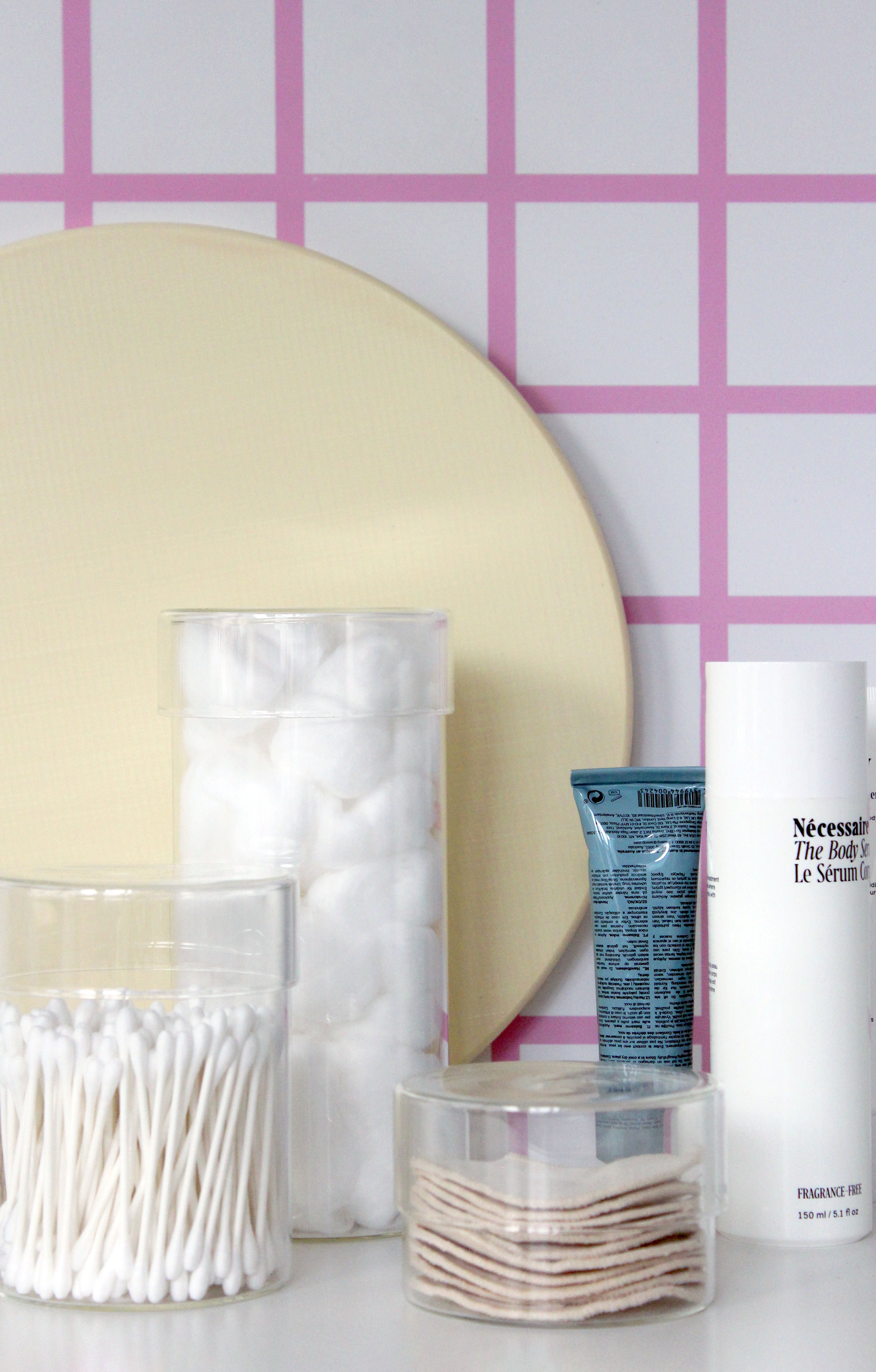 Fits neatly on the vanity tray and looks great alongside with the small and medium glass jars