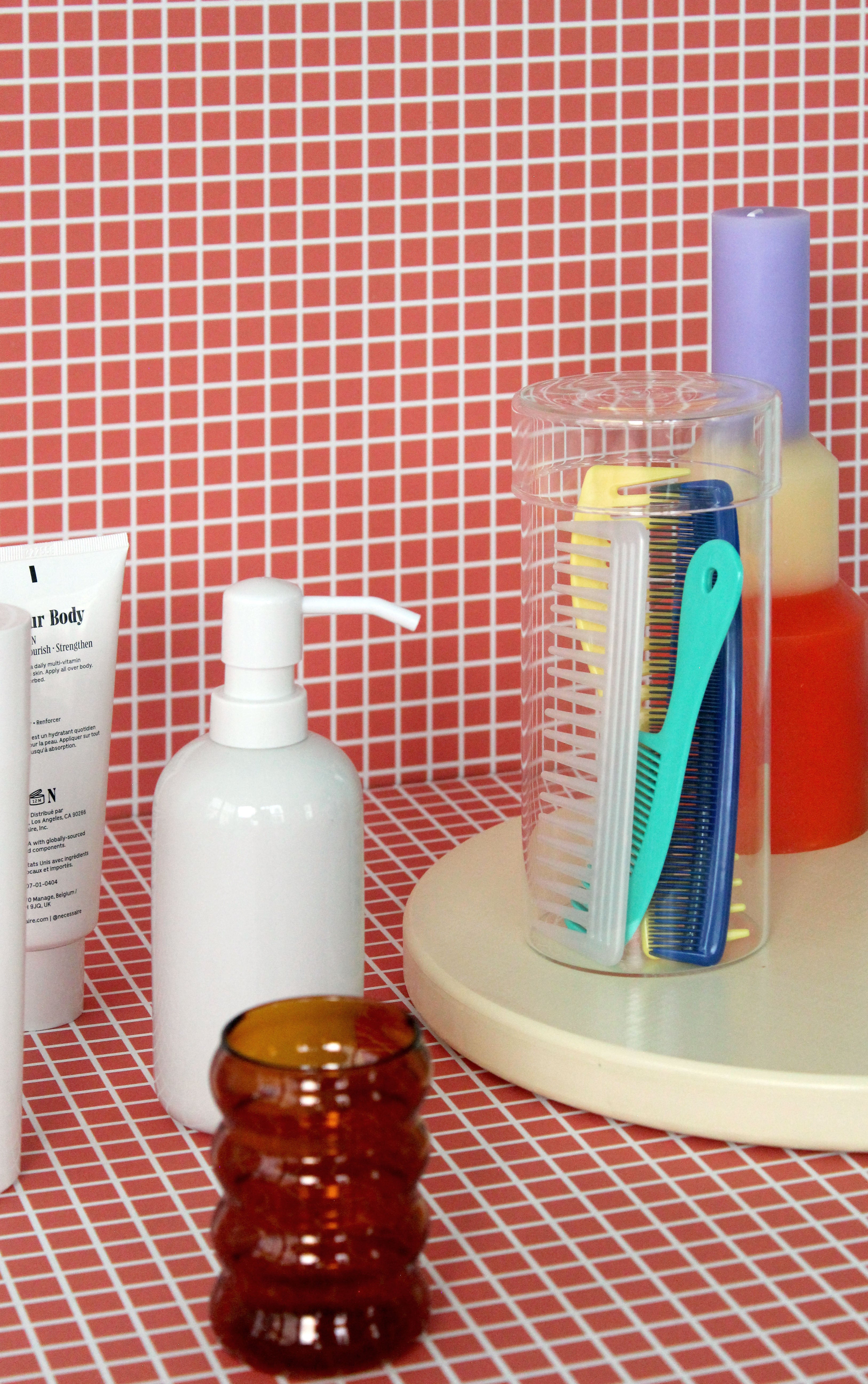 A large glass jar perfect for hair brushes and combs, large makeup brushes, flowers, and anything else you like to keep